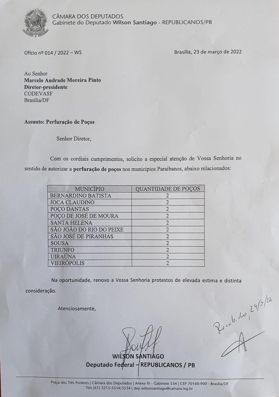 Na tarde da última quinta-feira (24), o prefeito Itamar Moreira esteve no gabinete do deputado federal Wilson Santiago, em Brasília, onde recebeu do deputado a garantia da destinação de uma emenda parlamentar de R$ 2 milhões para ser investido em abastecimento de água.