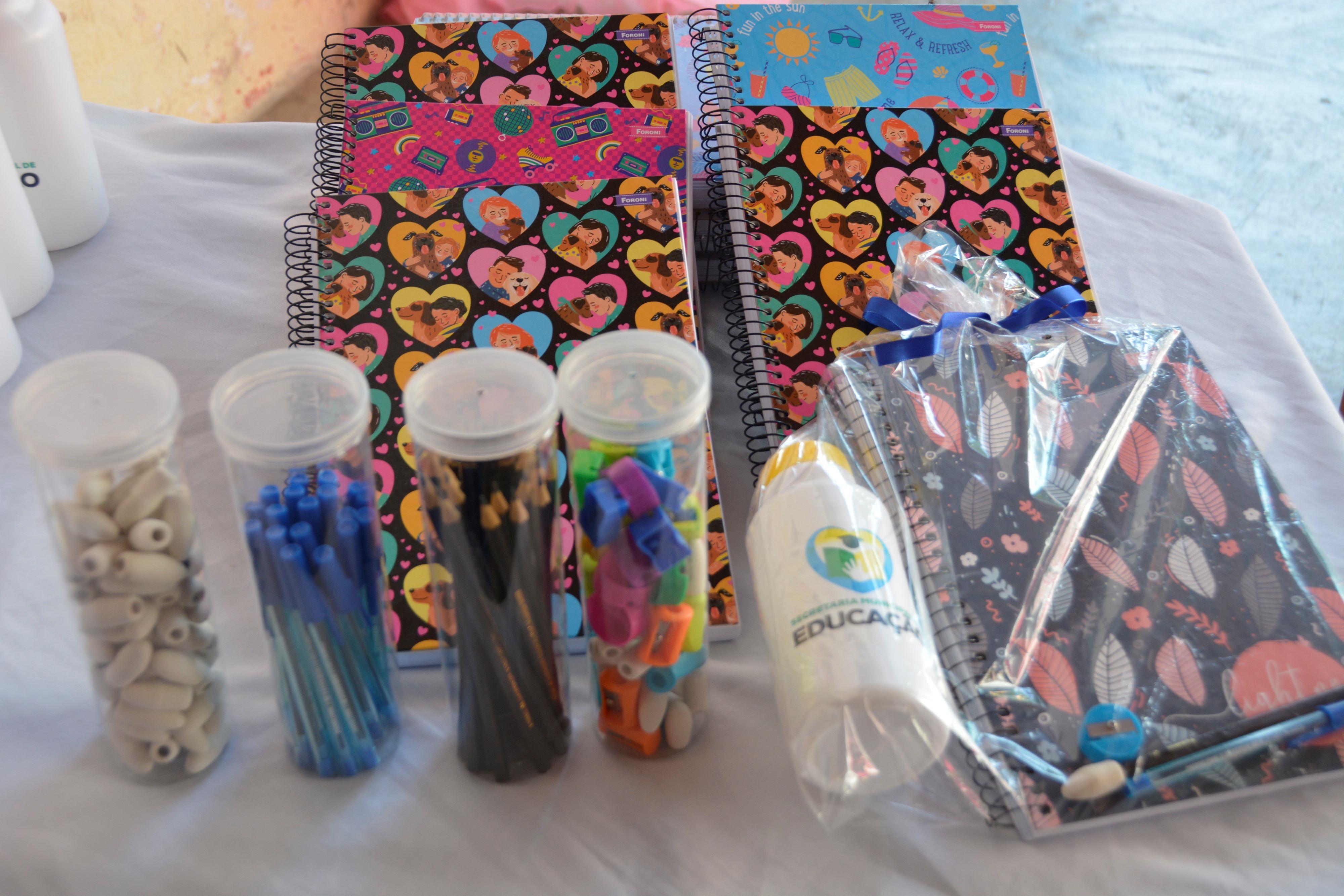 Neste ano, tanto os estudantes da Rede Municipal de Ensino receberam kits escolares, como também os professores e coordenadores receberam um kit montado especialmente para auxiliar na rotina de trabalho.