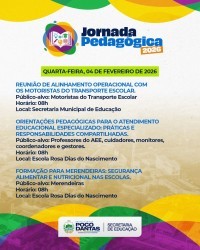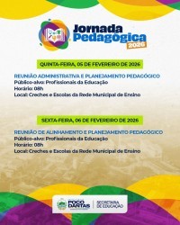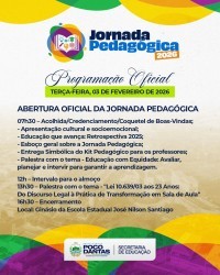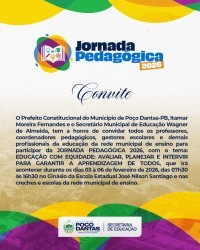 O Prefeito Constitucional do Munícipio de Poço Dantas-PB, Itamar Moreira Fernandes e o Secretário Municipal de Educação Wagner de Almeida, tem a honra de convidar todos os professores, coordenadores pedagógicos, gestores escolares e demais profissionais da educação da rede municipal de ensino para participar da JORNADA PEDAGÓGICA 2026, com o tema: EDUCAÇÃO COM EQUIDADE: AVALIAR, PLANEJAR E INTERVIR PARA GARANTIR A APRENDIZAGEM DE TODOS, que irá acontecer durante os dias 03 à 06 de fevereiro de 2026, das 07h30 às 16h30 no Ginásio da Escola Estadual José Nilson Santiago e nas creches e escolas da rede municipal de ensino.