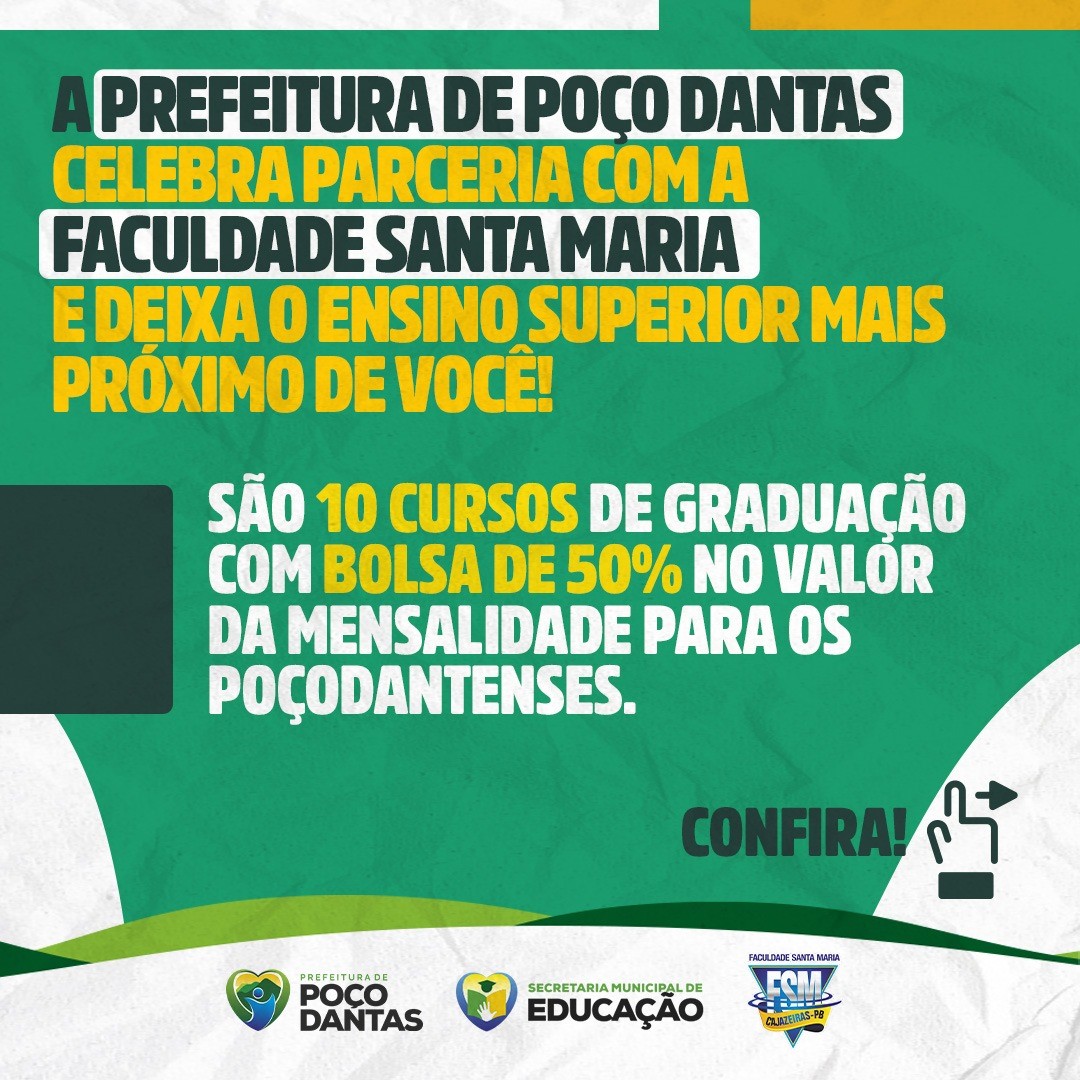 Para tornar o ensino superior cada vez mais acessível à população, a Prefeitura Municipal de Poço Dantas, através da Secretaria Municipal de Educação, renovou parceria firmada junto a Faculdade Santa Maria para concessão de bolsas no valor de 50% para alunos poçodantenses.