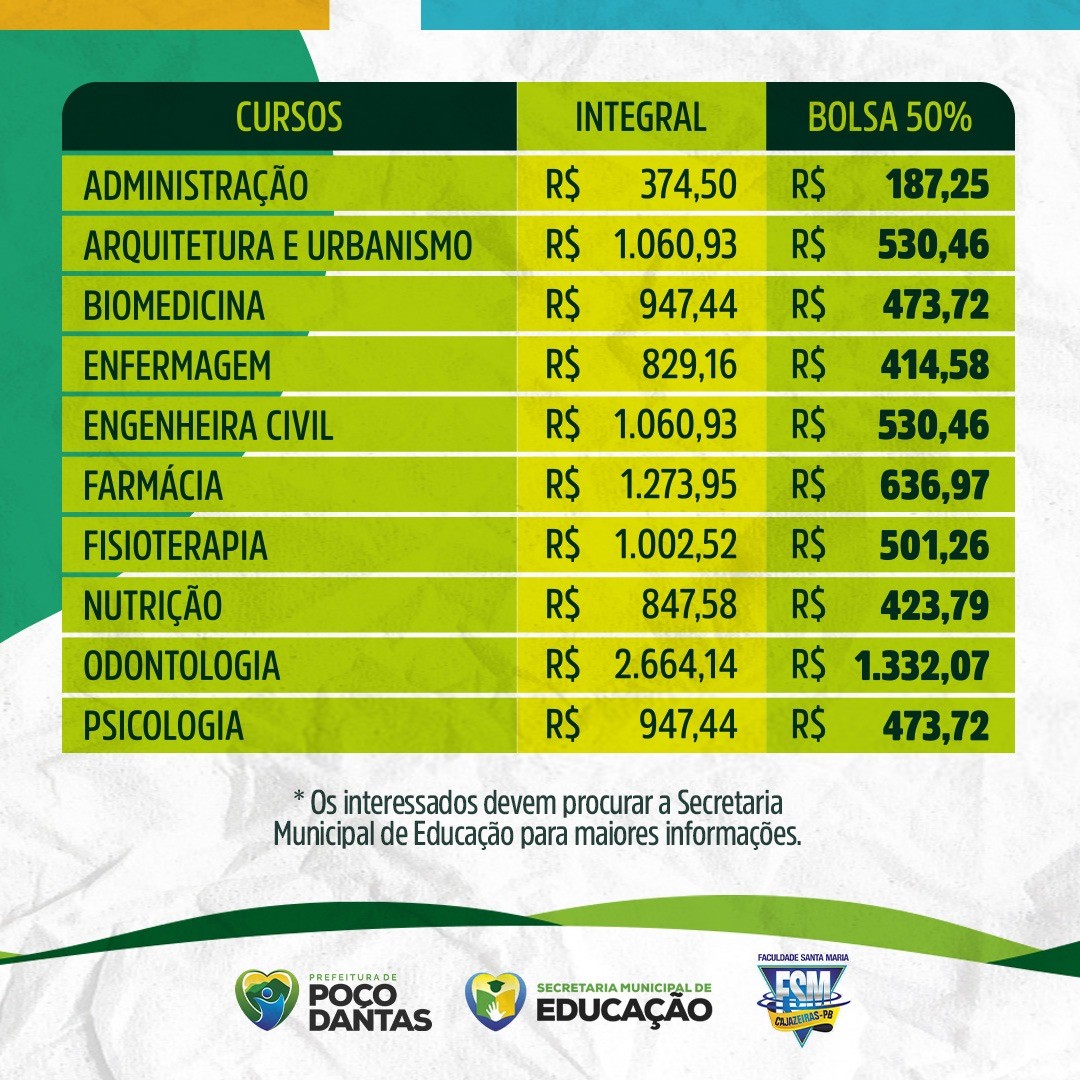 A bolsa de 50% de desconto no valor integral das mensalidades é válida para os cursos de Administração, Arquitetura e Urbanismo, Biomedicina, Enfermagem, Engenharia Civil, Farmácia, Fisioterapia, Nutrição, Odontologia e Psicologia. Os interessados devem procurar a Secretaria Municipal de Educação para maiores informações e esclarecimentos sobre o projeto.